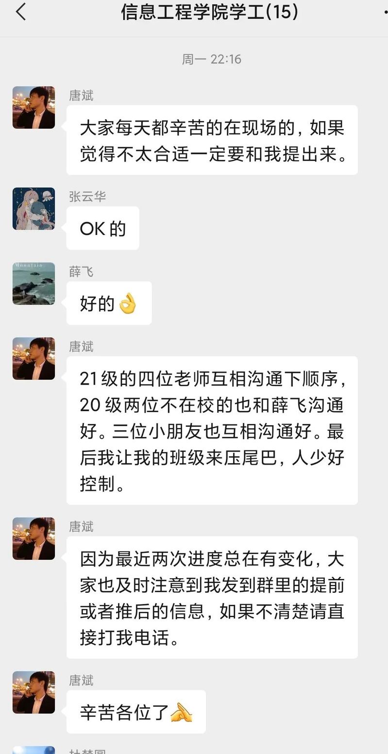 从组织安排学院核酸时间到排摸学生核酸完成情况,他事必躬亲。每日核酸检测时,他会提前赶到现场组织现场秩序,待到学院大部队做完后,他又会默默跟在学院队伍最后与学生们一起排队做核酸。降温时,他会细心地提醒路过的学生们记得多添一件衣物,学生未按照要求间隔2米时,他又会耐心地提醒学生们严格遵守防疫要求,禁止“贴贴”。