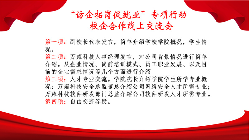 为认真贯彻落实党中央、国务院关于高校毕业生就业工作的决策部署,全面深化校企合作、为毕业生开拓更多就业创业岗位和机会,促进毕业生高质量就业。信息工程学院访企拓岗促就业专项行动校企交流会,于5月19日在线上举行,线上走访了上海万雍科技股份有限公司。