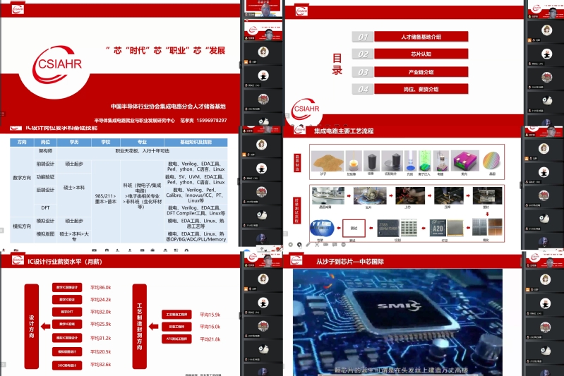 今天很荣幸参与到了中国半导体行业协会集成电路分会人才储备基地的范孝爽老师的巡讲,讲述了关于集成电路行业,分为了四部分,芯片介绍、产业链介绍、岗位薪资介绍、人才储备基地介绍。使我们了解集成电路的产业背景知识及产业链现状,强调了就业岗位的空缺需求,借助此活动激发我们对半导体行业的兴趣和信心,努力提升自己,对我们未来的职业规划做了极大的帮助。