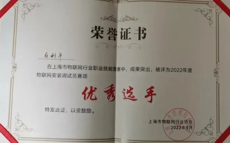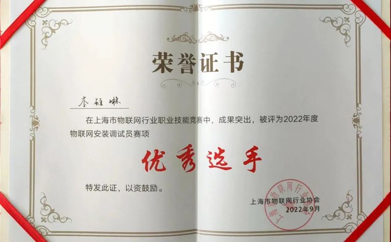 2022年9月24日,信息工程学院20物联网1班李雅琳同学参加了2022年上海市物联网行业职业技能竞赛,经过现场各位优秀选手激烈的角逐,荣获“物联网安装调试员”赛项第二名,获得“物联网安装调试员(三级)”国家职业能力证书,并且李雅琳同学将代表上海参加全国服务型制造应用技术技能大赛。