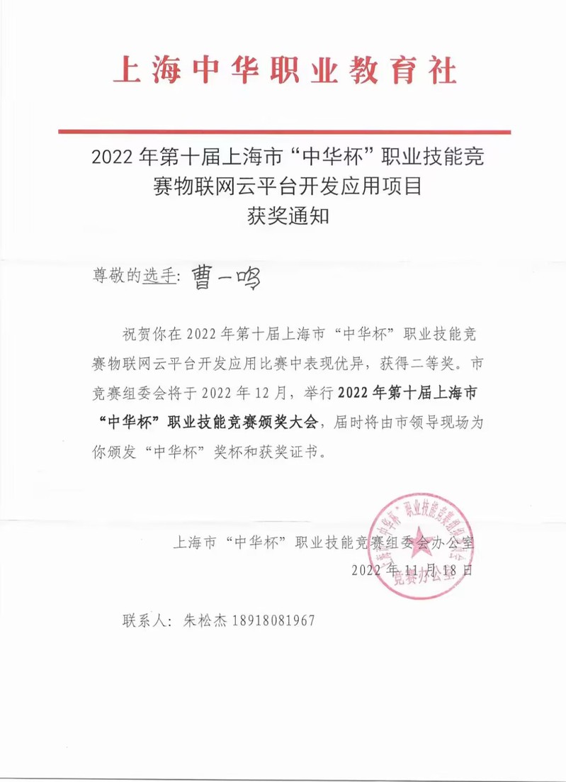 由于信息工程学院马利平,韩文海两位老师带队指导的史雯瑞、曹一鸣、吕卓婷、周玮捷共四位同学参加了此次比赛,参加比赛的同学都顶住压力、克服困难、表现优异,尤其是20物联网专升本班的曹一鸣同学依靠自己扎实的基础实力及良好的心理素质在高手云集的参赛选手中脱颖而出喜获二等奖。