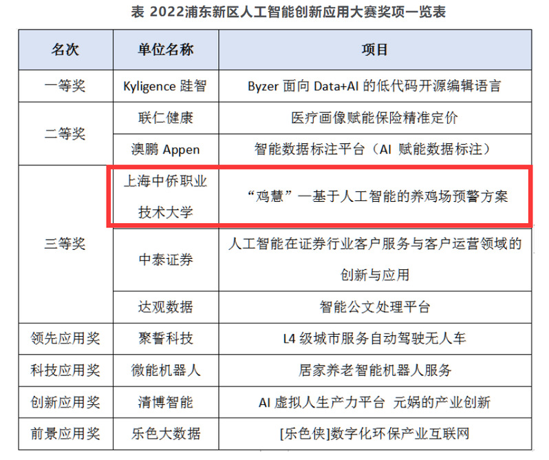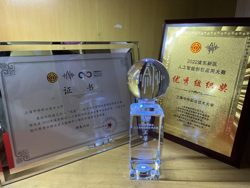 由信息工程学院赵欣、刘群、袁明老师带队指导的《“鸡慧”—基于人工智能的养鸡场预警方案》项目,学生团队分别是由张正裕、李泓潭、程琳三位同学。参赛同学认真备赛、克服困难、在113支队伍中脱颖而出,挺近总决赛前十强,在总决赛十强中唯独剩余一家院校团队—上海中侨职业技术大学。通过总决赛的答辩,与众多企业同台竞技,脱颖而出,项目荣获总决赛三等奖,团队项目同时入围上海现代服务业联合会大数据中心智能科技项目资源库,上海中侨职业技术大学荣获“优秀组织奖”。