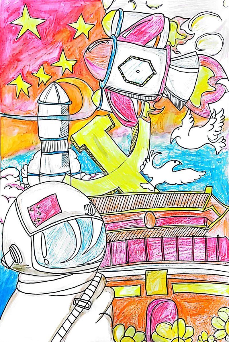 作品介绍: 生在红旗下,长在春风里,目光所致,皆为华夏,五星闪耀为信仰,航天梦助推强国梦,火箭升起的烟雾,那群白鸽从湛蓝的天空飞过,只有祖国强大,才能保证人民对和平的期望。