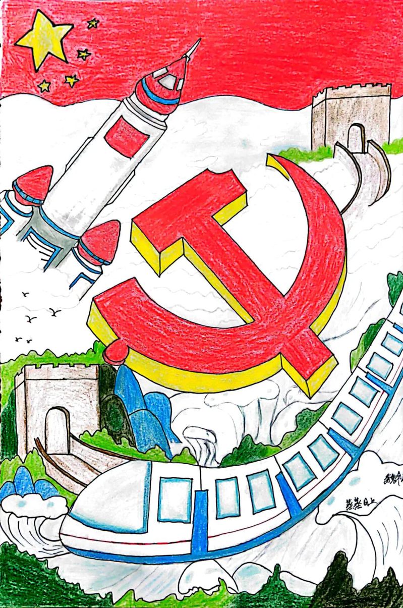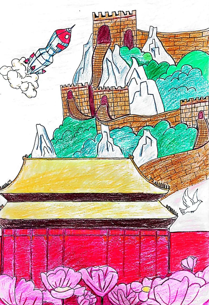 作品介绍: 以高铁、火箭等元素,突出了我国科技的日新月异、蓬勃发展,体现了中国共产党昂扬向上、奋发进取的精神风貌。长城是中华民族古老文明的丰碑和智慧结晶,由衷的感到骄傲和自豪!