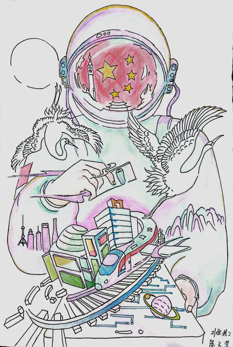 作品介绍: 作品上有许多象征着中国科技发达的代表物品,例如高铁与高高耸立的大厦,整体是以宇航员为主体,象征着中国将要扬帆起航,逐梦九天。