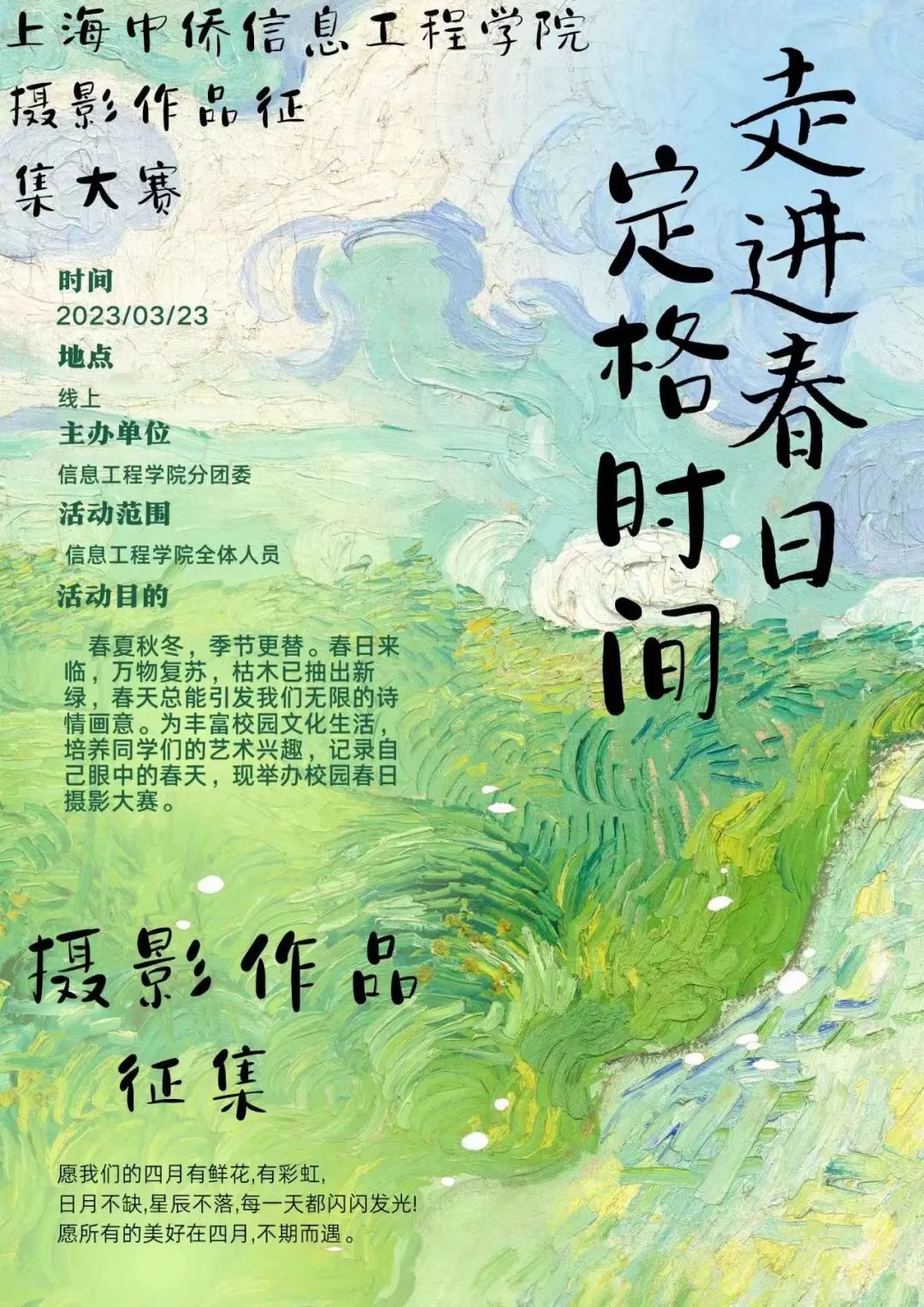 春夏秋冬,季节更替。春日来临,万物复苏,枯木已抽出新绿,春天总能引发我们无限的诗情画意。为丰富校园文化生活,培养同学们的艺术兴趣,记录自己眼中的春天,现举办校园春日摄影大赛。