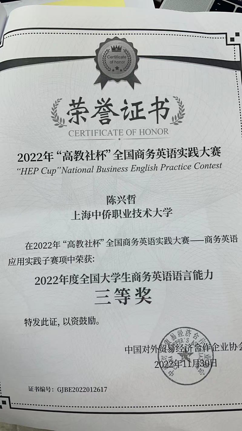 恭喜陈兴哲同学荣获2022年“高教社杯”全国商务英语时间大赛三等奖