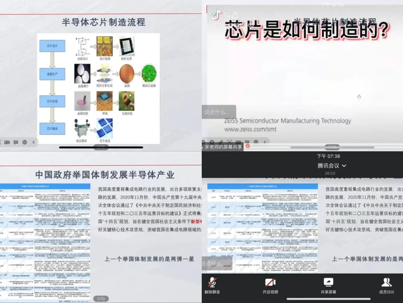 会议伊始,宋长雷老师先对半导体产业进行了详细介绍,他分别从半导体产业的重要性、现状以及中国政府对半导体产业的重视程度展开讲解,并通过播放视频的形式带同学们一起了解半导体芯片制作流程。宋老师详尽阐述了半导体芯片的制造流程、人才现状、人才需求等现状,使同学们对半导体产业产生初步了解,提升了同学们对半导体产业的就业兴趣。