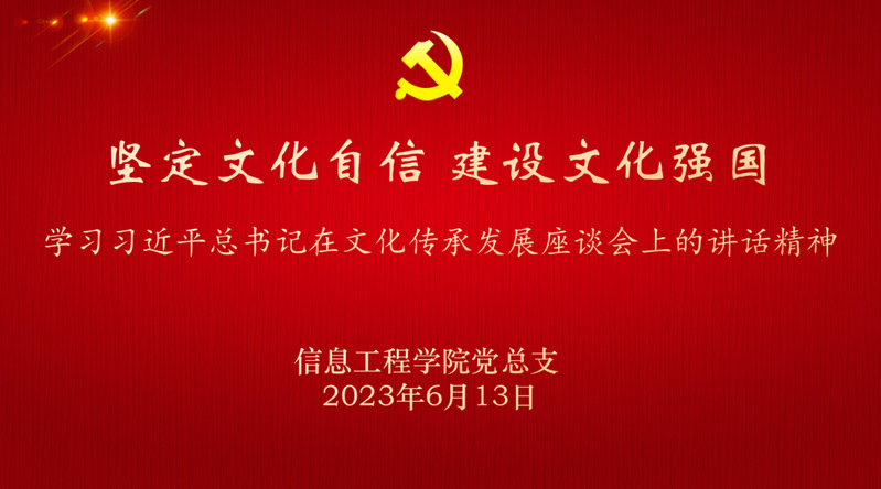 6月13日,信息工程学院党总支召开全体党员大会,集中学习了习近平总书记在北京出席文化传承发展座谈会上发表的重要讲话,并就讲话精神进行了深入交流和研讨。大家纷纷表示要以习近平总书记重要讲话精神为指导,更好担负起新的文化使命。坚定文化自信自强,为扎实推进中华民族现代文明和社会主义文化强国建设作贡献。