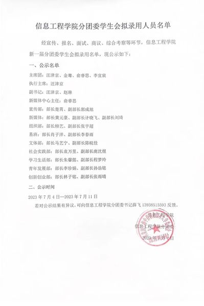 依据上海中侨职业技术大学信息工程学院分团委、学生会部门负责人竞聘通知,在上级团委及相关师生代表的监督下,经个人自荐和组织推荐,分团委、学生会组织资格审查、线上竞选答辩,多方面考察候选人的综合情况,经综合考评,上海中侨职业技术大学信息工程学院分团委、学生会各部门负责人已基本拟定。