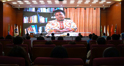 开幕式现场播放金砖国家工商理事会技能发展工作组主席Mapule Ncanywa (马普勒·恩坎瓦)女士来自南非的祝福视频。