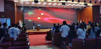 开幕式现场,全场起立,高唱中华人民共和国国歌。