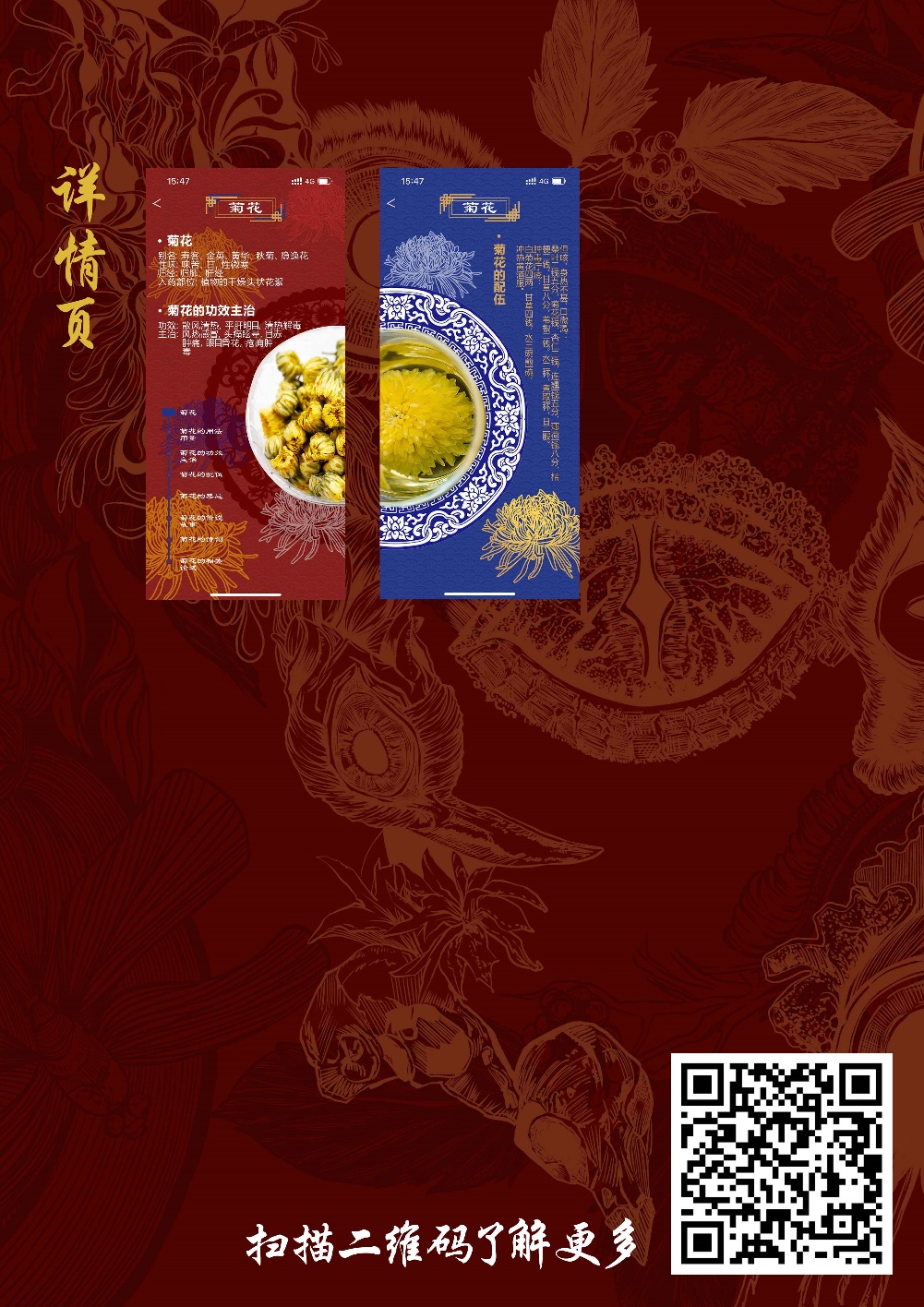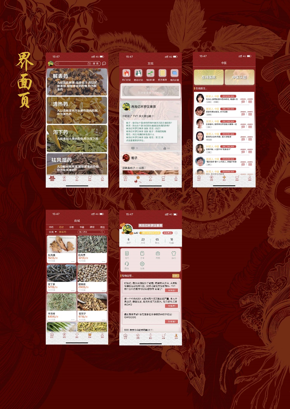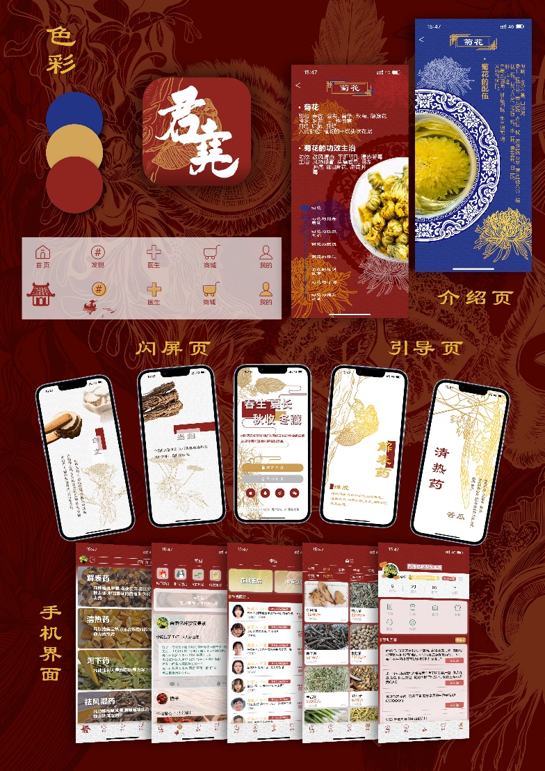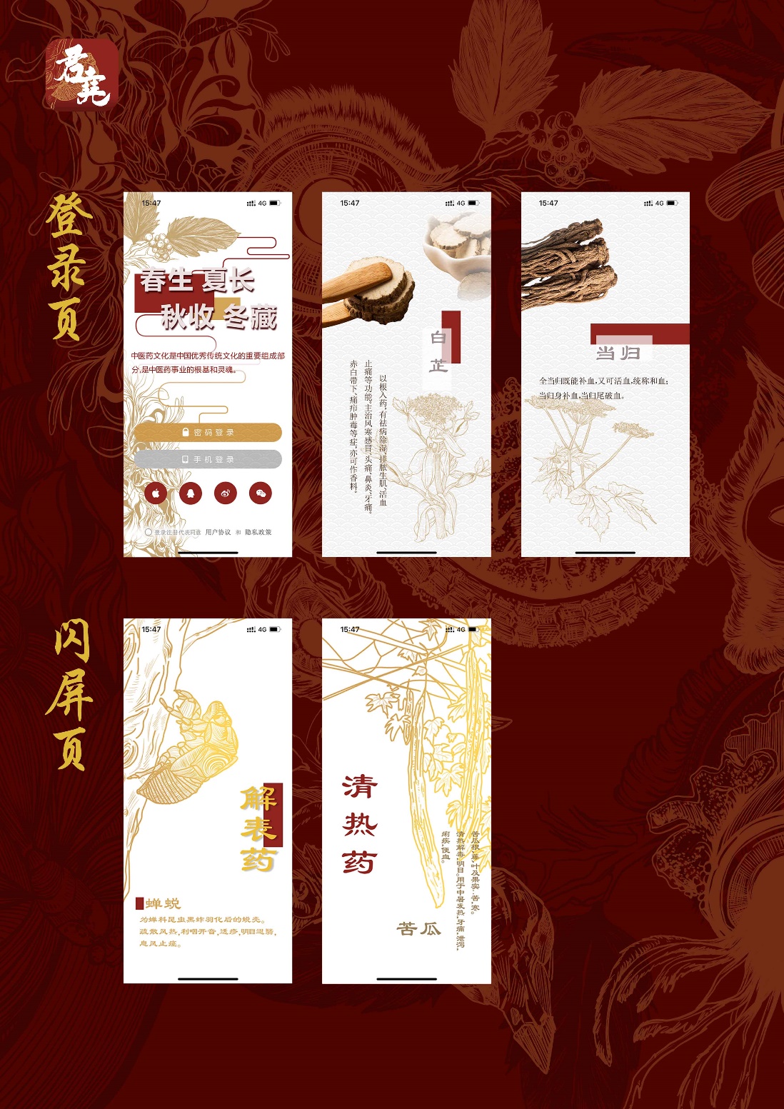 中医药非物质文化遗产是中医药宝库中的精华精髓,是国家非物质文化遗产体系建设的重要组成部分。君尧app是一款为大众群体打造的中药类科普app。要做的不仅是科普中药学相关知识,更是要发扬中国传统文化,实现中药学文化的传播。APP内设有中药知识科普,可以根据拍照、搜索、查询、分类找到相对应的中药。相关还设有交流中心,医生咨询,购买界面,我的界面。正真做到科普文化,便利大众,可以实际使用。界面内有许多中药插画,中国元素,弘扬中华文化你我有责!中医文化历史悠久,独具内涵。而作为一名数字媒体技术专业的学生,UI设计是我让中医文化与世界相互动融合的方式。我也愿意用我的专业知识,用平面设计去宣传中医中药的重要性,让更多人了解中医药,让中医药“活”起来。