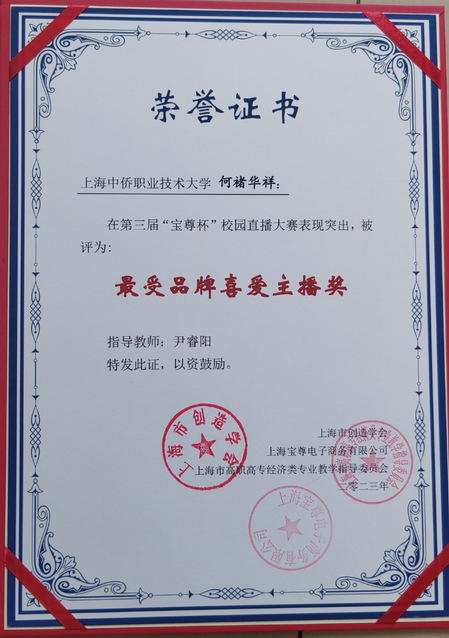 经过激烈角逐,信息工程学院何褚华祥同学荣获个人“最受品牌喜爱主播奖”;尹睿阳老师荣获“优秀指导老师”称号,学校荣获“优秀院校组织奖”。