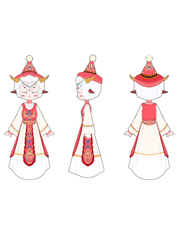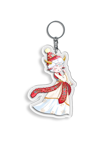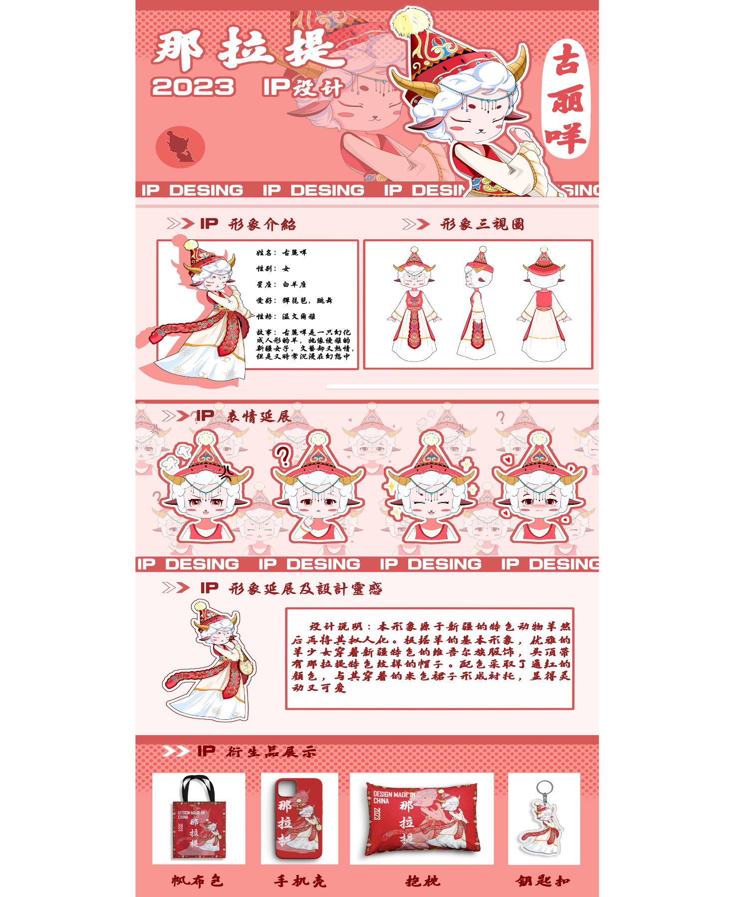 通过将那拉提的自然美景、文化和特色元素融合在一起,创造出了“古丽咩”这个动漫形象IP和衍生品。古丽咩形象源于新疆的特色动物羊然后再将其拟人化。根据羊的基本形象,优雅的羊少女穿着新疆特色的维吾尔族服饰,头顶带有那拉提特色纹样的帽子。配色采取了通红的颜色,与其穿着的米色裙子形成衬托,同时结合了新疆非遗琴弹拨尔,显得灵动又可爱。通过这个动漫形象IP衍生出了具有特色的帆布袋钥匙扣等产品。