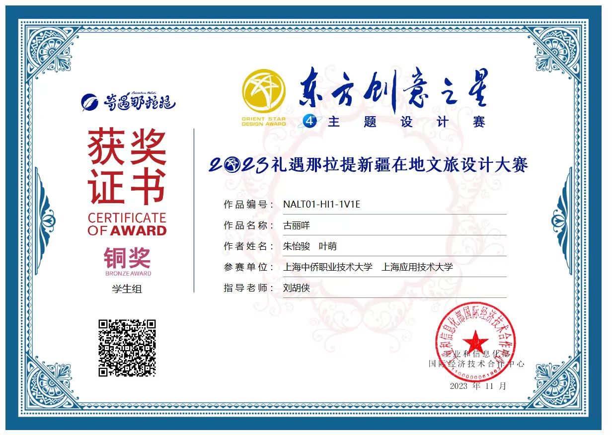 11月6日,第四届东方创意之星设计大赛主题设计赛项——2023礼遇那拉提新疆在地文旅主题设计大赛获奖名单正式揭晓,信息工程学院刘胡侠老师指导的21数媒3朱怡骏的《古丽咩》作品荣获文创设计类铜奖。
