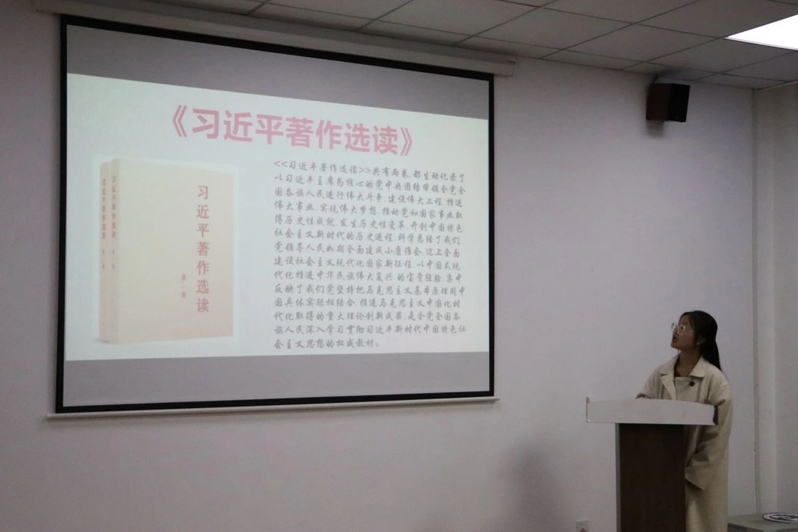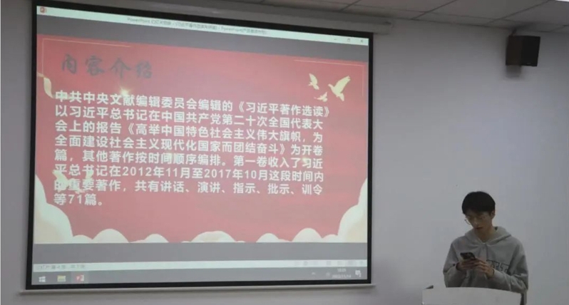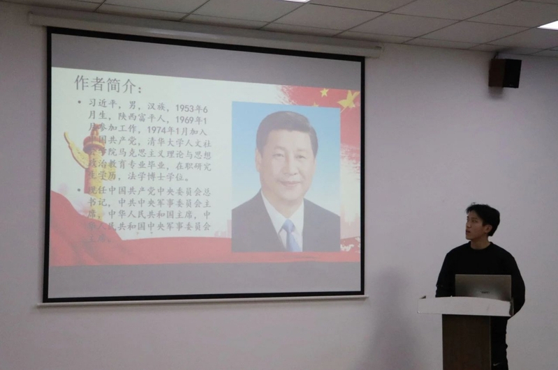 23计应4班郑愉骞同学从作者简介、内容概述、书籍影响、阅读感悟四个方面介绍了《习近平谈治国理政》这本书。郑愉骞同学主要介绍了这本书的内容包括关于坚持和发展中国特色社会主义、关于实现中华民族伟大复兴的中国梦、关于全面深化改革、关于走和平发展道路。该书籍发行到世界100多个国家和地区,至今已经累计发行1100多万册,受到了外媒和国际观察人士的高度关注。