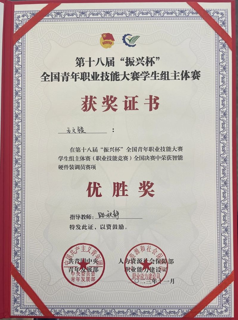 11月28日,第十八届“振兴杯”全国青年职业技能大赛学生组主体赛全国总决赛在杭州落下帷幕。信息工程学院派出了2支队伍分别由路秋静老师和齐福利老师指导参加的智能硬件装调员和无人机驾驶员两个赛项,经历了2天激烈的角逐,最后智能硬件装调员赛项的22物联本科1班的毛文骏同学获得优胜奖。