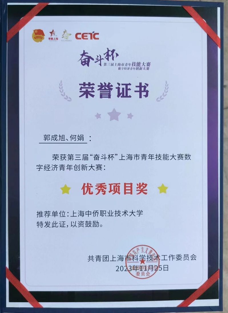 在共青团上海市委员会的指导和大力支持下,由共青团上海市科学技术工作委员会和共青团上海市嘉定区委员会主办、中电科数字科技(集团)有限公司承办的“奋斗杯”第三届上海市青年技能大赛数字经济青年创新大赛自7月28日起正式开赛,历经4个月的紧张赛程,两轮云上评审,信息工程学院刘群、袁明、齐福利老师指导的郭成旭、何娟两位同学组成的参赛团队,凭借“污”源速查—新型低成本管网溯源创新项目荣获“优秀项目奖”。
