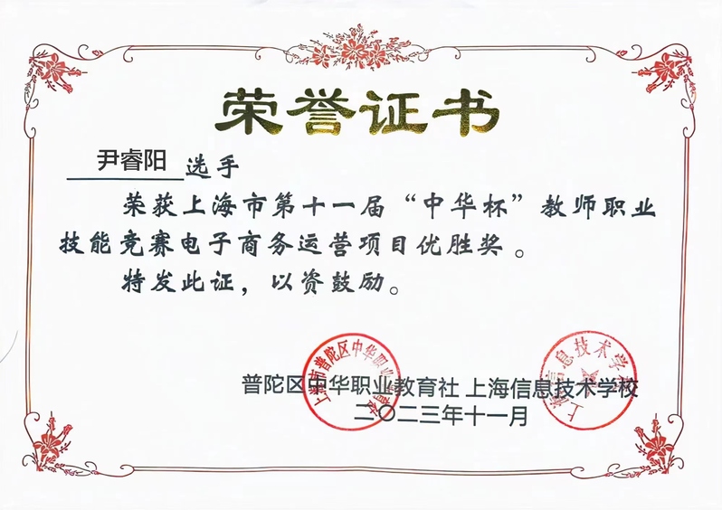 信息工程学院柳学斌、齐福利、尹睿阳三位老师在第十一届上海市“中华杯”教师职业技能竞赛电子商务运营赛项中获优胜奖。