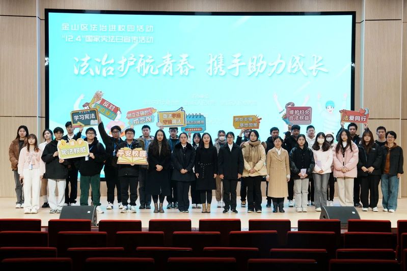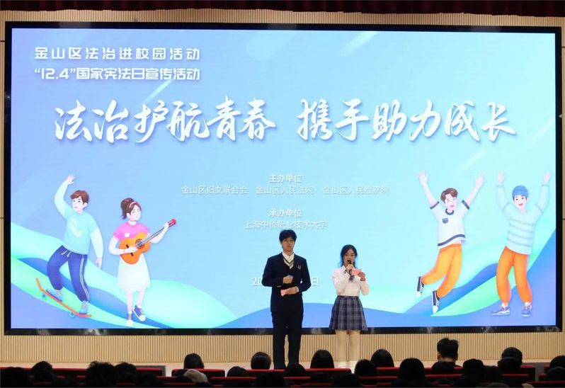 今年12月4日是第十个国家宪法日,金山区积极开展宪法宣传月活动。由金山区妇女联合会、金山区人民法院、金山区人民检察院主办,上海中侨职业技术大学信息工程学院承办的“法治护航青春 携手助力成长—金山区法治进校园活动”于12月1日在学校图书馆2楼学术厅举行,金山区妇联维权干部时蓓莉,区检察院第一检察部副主任施翀,区法院民庭审判员江彧超,区法理情女子会秘书长、上海金亭律师事务所律师葛怡忆,信息工程学院党总支副书记唐斌老师以及500余名同学参与此次主题学习活动。