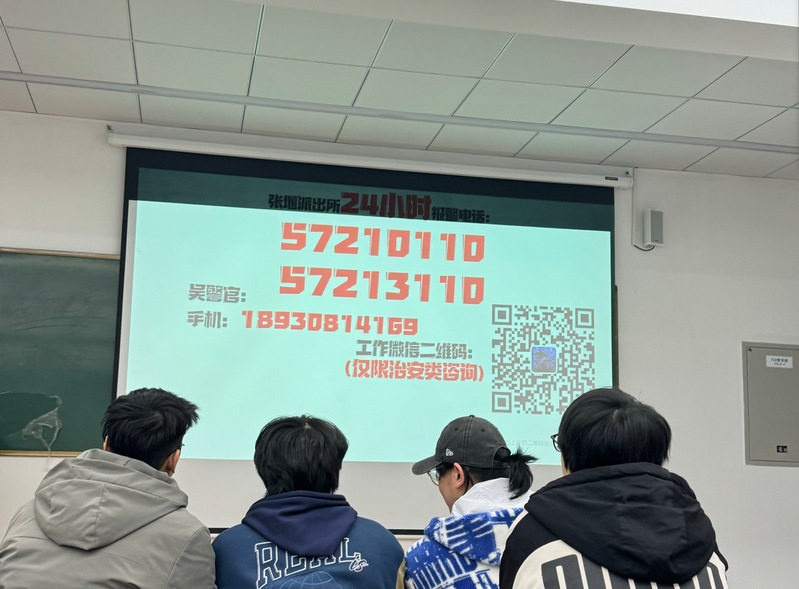 为了更好地帮助学生预防电信诈骗,大家在投影屏幕上循环播放张堰镇派出所紧急求助电话57210110和57213110。