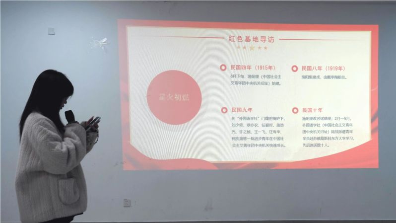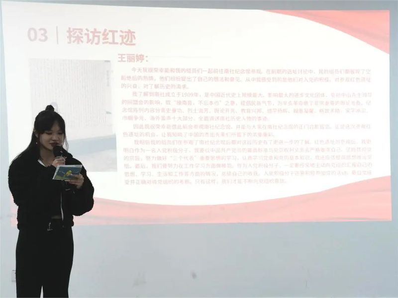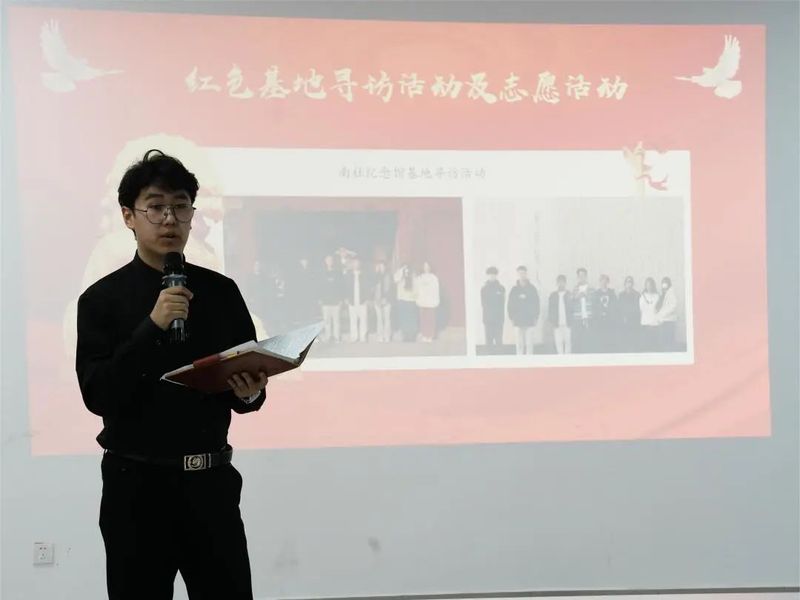 汇报过程中,各组代表纷纷采用PPT的形式依序分享成员们的学习感悟、志愿经历以及寻访红色基地的体会、经历等。
