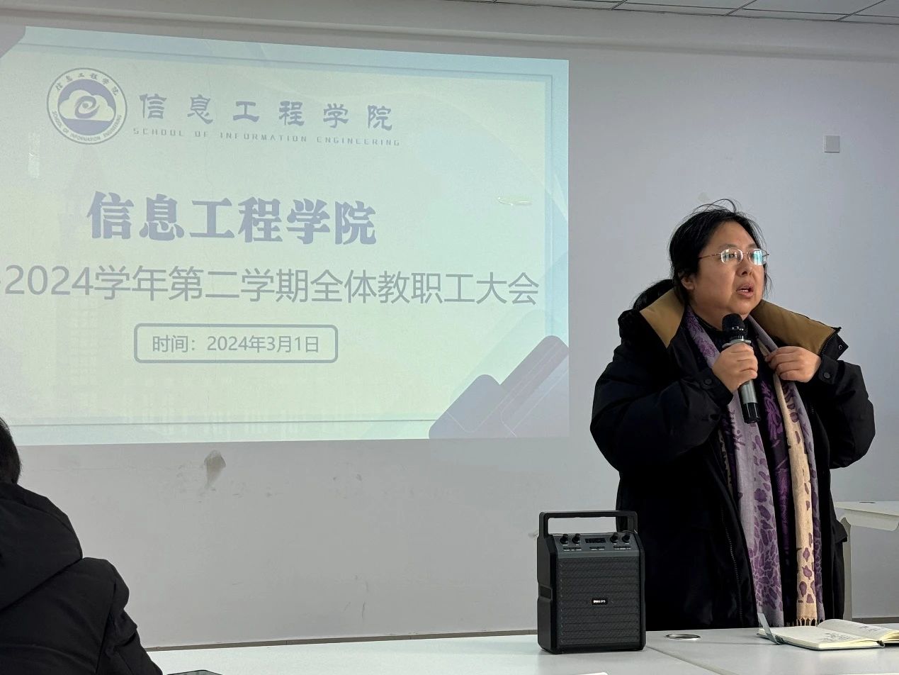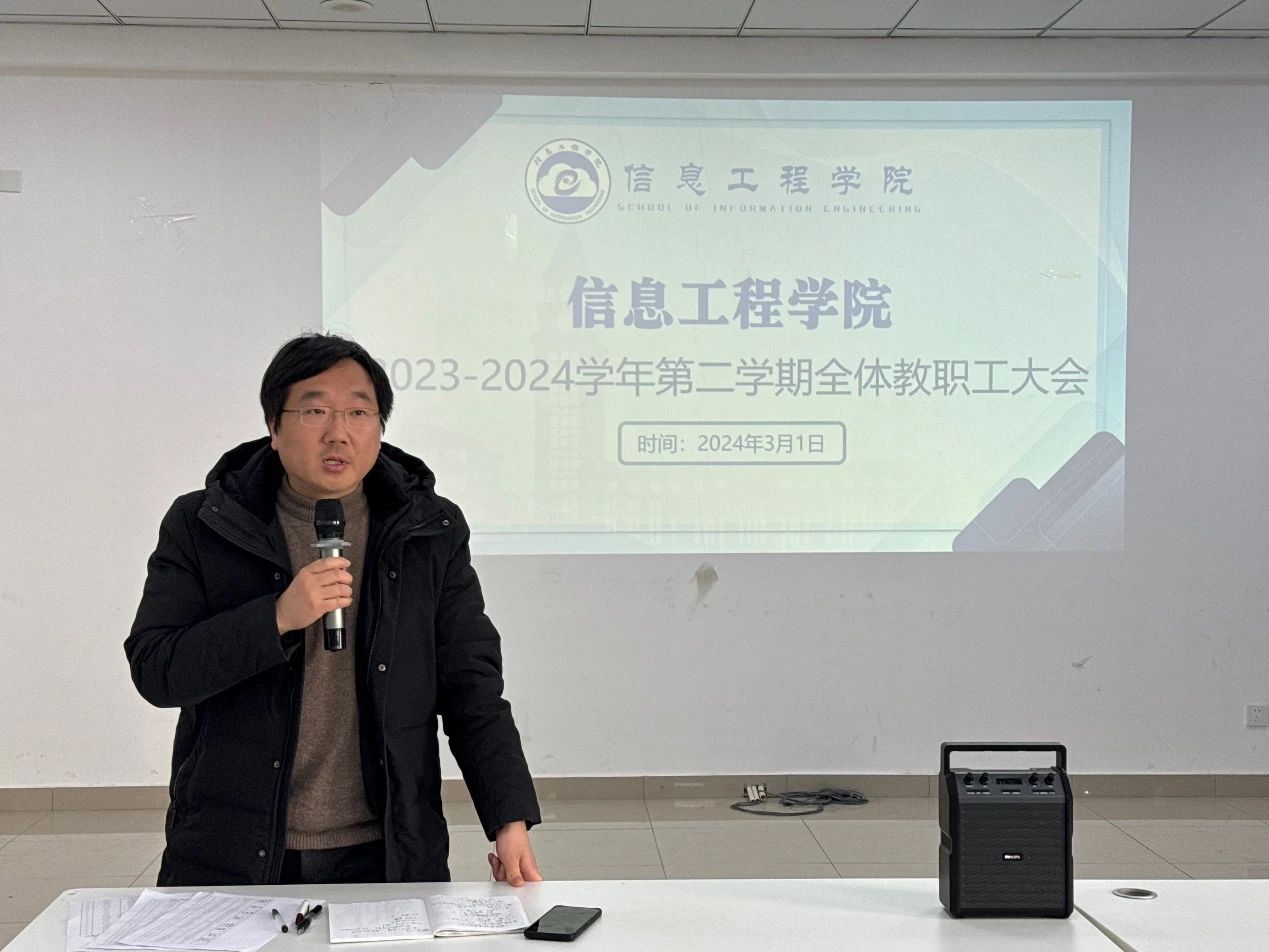 在新春的龙跃中汇聚力量,以齐心协力的决心描绘新篇章,信息工程学院于3月1日在9号楼501室举行了2024年新学期的教职工大会,以崭新的气象,启动了新学期的序幕。参会人员包括院长赵欣、副院长袁明、党总支副书记唐斌,以及学院全体教职员工。会议由赵欣院长主持。