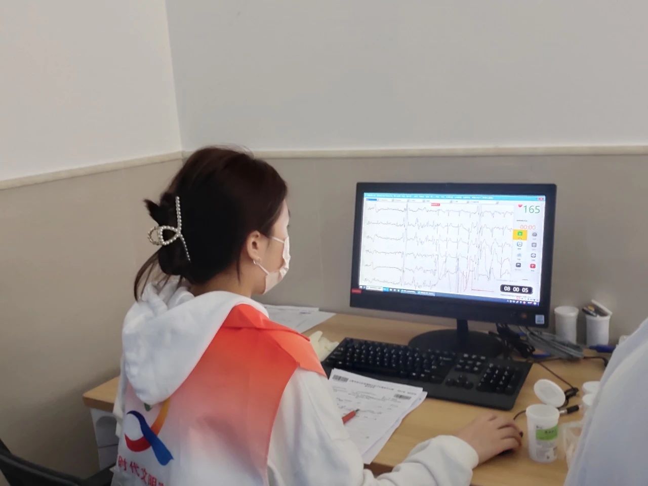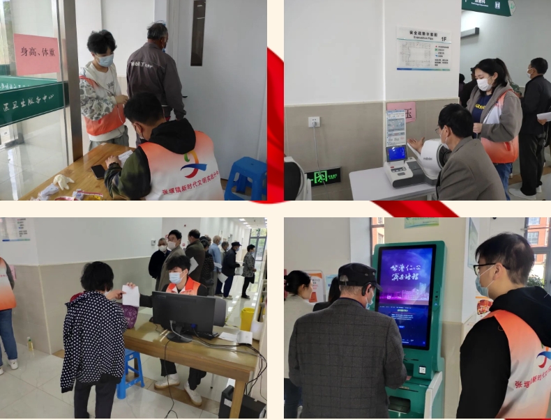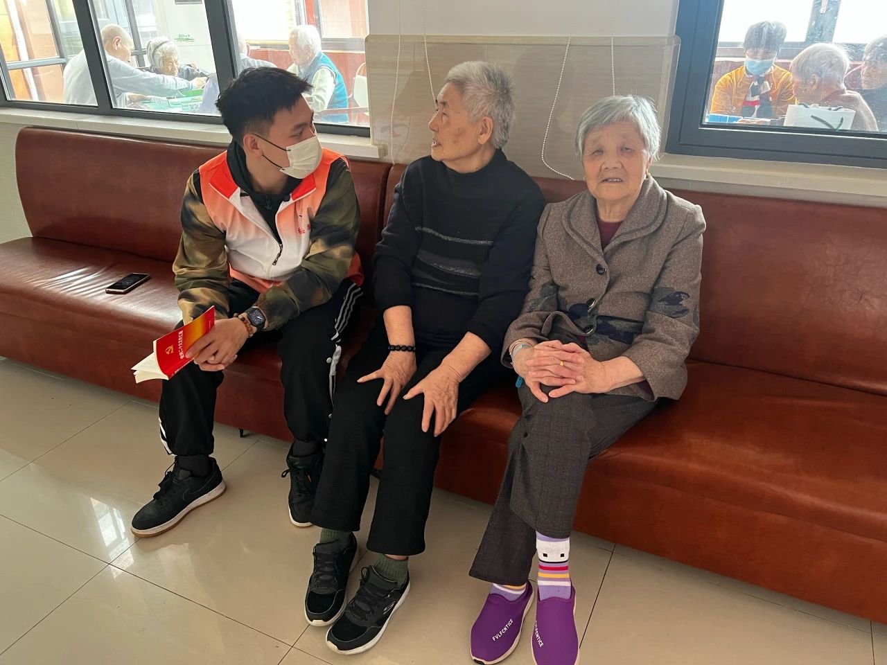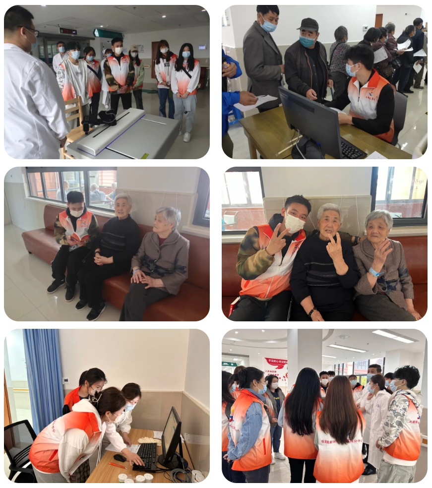 在董心怡同学的带领下,志愿者们早早地集合,开始了一天的志愿服务活动。他们分成两组,一部分在全科门诊处协助医务人员完成老人体检工作,另一部分则在老人房间进行慰问。他们帮助老人们自助测量血压,缓解他们的紧张情绪,并陪伴他们聊天,倾听他们的过往故事,让他们的生活充满了欢乐和温暖。