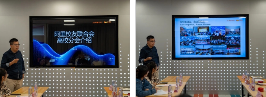 上海中侨职业技术大学就业创业导师、阿里校友联合会高校特派员、数花科技总裁周阳先生分别从阿里校友联合会、阿里校友加速器、创始人俱乐部、阿里校友联合会高校分会、高校特派员业务、横向课题模块等各方面展开,介绍了阿里校友联合会高校分会的作用和意义,强调校企合作的重要性,他说大学毕业正好十年,是腾讯和阿里培养了他,作为阿里校友,有责任利用自身的资源为国家新质人才,培养贡献力量。