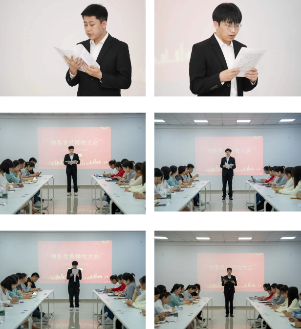 王锡江同学作为预备党员代表发表讲话:“作为一名预备党员,我深感荣幸,同时也感到肩上的责任重大。”他声音洪亮,吐字清晰,透露出坚定的信念,“成为党员,不仅是个人的荣耀,更是对我们青年一代的期望和重托。在未来的日子里,我将以更高的标准要求自己,努力学习党的理论,积极投身社会实践,争取早日成为一名合格的正式党员。我也希望大家能和我一起,为党的事业贡献自己的青春力量,共同为实现中华民族伟大复兴的中国梦而奋斗!”