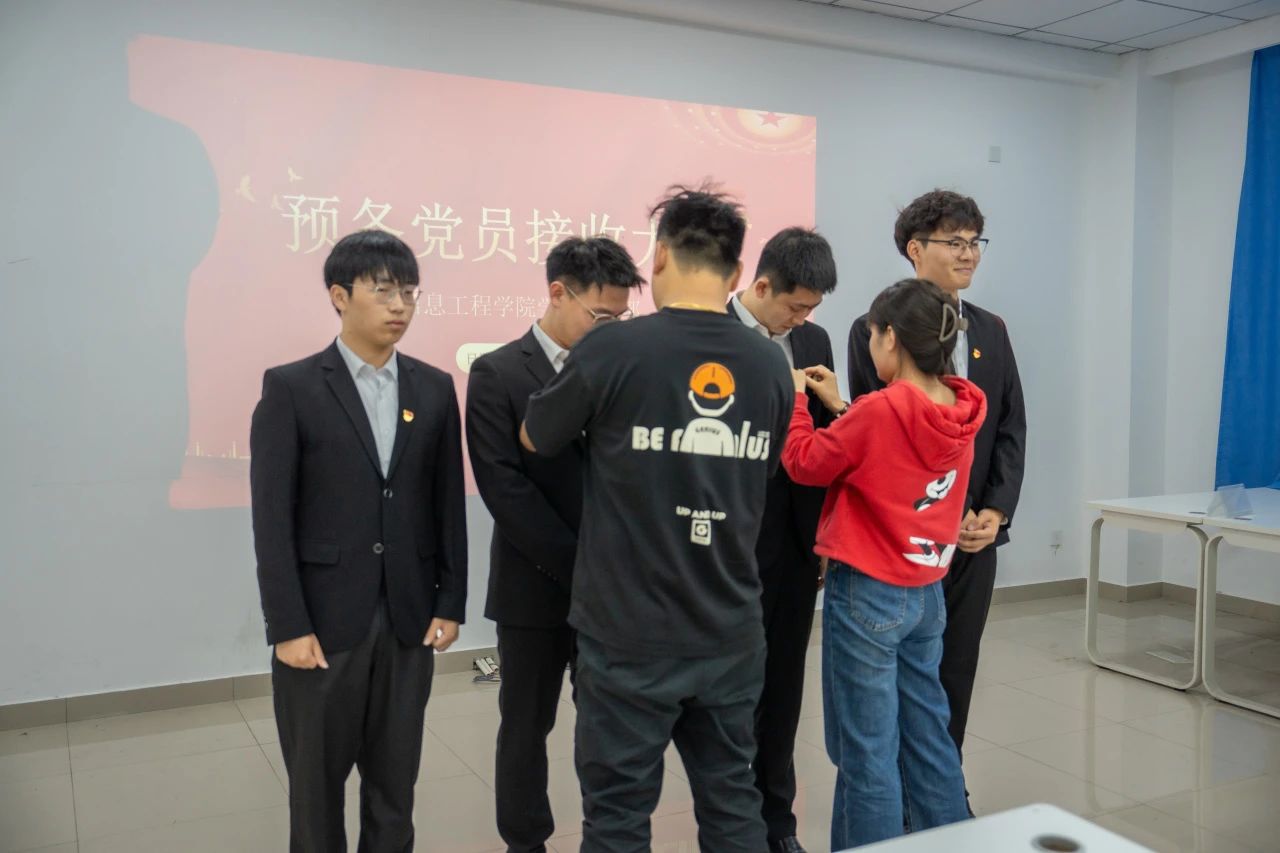 信息工程学院党总支副书记唐斌、学生党支部书记郑敏为新预备党员佩戴党徽。