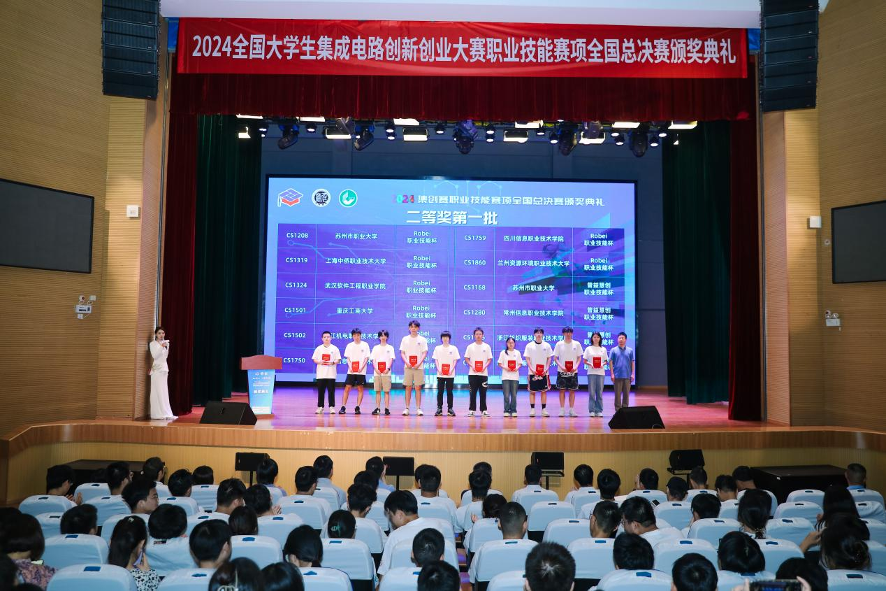 在 2024 年全国大学生集成电路创新创业大赛职业技能赛项全国总决赛中,信息工程学院由赵欣、柳学斌老师指导的潘奕均、杨雯皓两位同学组成的参赛队,与来自全国高校的 260 余支队伍同场竞技。经过激烈比拼,凭借卓越表现,最终斩获Robei 职业技能杯国赛二等奖,荣耀而归。