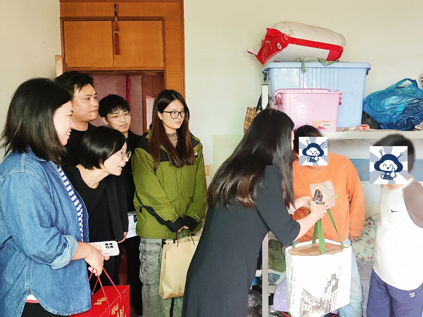 座谈会后,大家怀着深切的关怀与爱意,走访并慰问了特殊困难儿童家庭。这些孩子由于病情影响,在言语交流方面存在一定困难与障碍。学院老师精心准备了牛奶、坚果礼包以及带有 “中侨青年” 的文创用品作为慰问礼物赠予孩子们,期望能为他们带去温暖与欢乐。孩子们以纯真的眼神、无邪的笑容以及力所能及的肢体动作,向在场关爱他们的人表达了最真挚的欢迎与感激。这份超越言语的情感交流,深深触动了每一位参与活动的人,让大家更加坚定了投身公益事业、为特殊人群及家庭提供更多关爱与支持的决心。