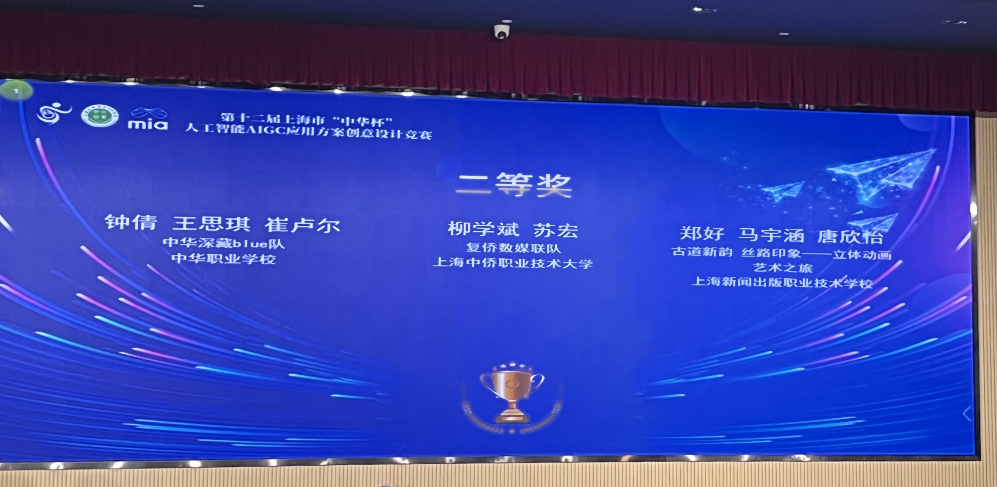 2024年11月9日,第十二届上海市“中华杯”AIGC人工智能应用方案创意设计竞赛在上海农林职业技术学院举行。信息工程学院的柳学斌老师荣获二等奖,陈贇老师以及廖英杰、吴雨霏同学分别获得未来之星奖。