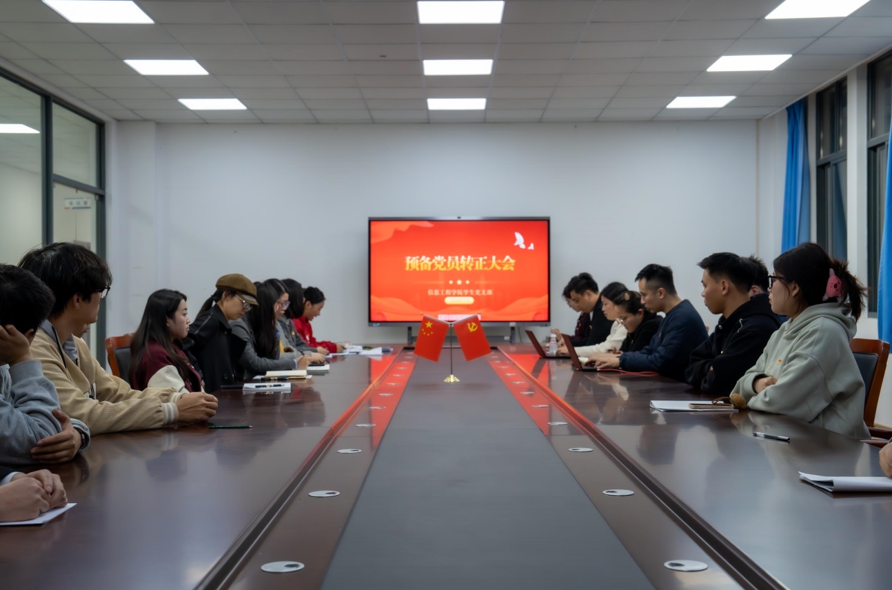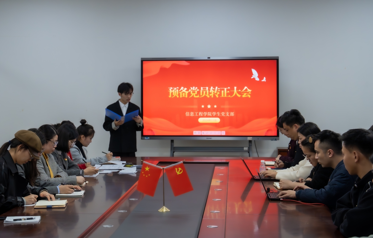 为进一步强化党组织建设根基,细化党员发展路径,信息工程学院于2024年11月21日20:00在9号楼306室召开预备党员转正大会。大会就预备党员金骞、张慧莹、郭杰三位同志的转正问题进行讨论。会议由信息工程学院党总支组织委员鲁娇老师主持,支部全体党员参加。