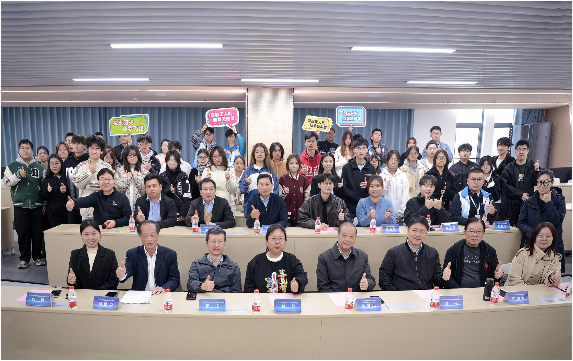 启动仪式上,学员手持各式铭牌,兴高采烈地和各位嘉宾一起合影留念,共同表示“共享阳光·让梦飞翔”,“学习无人机·点亮新未来”。
