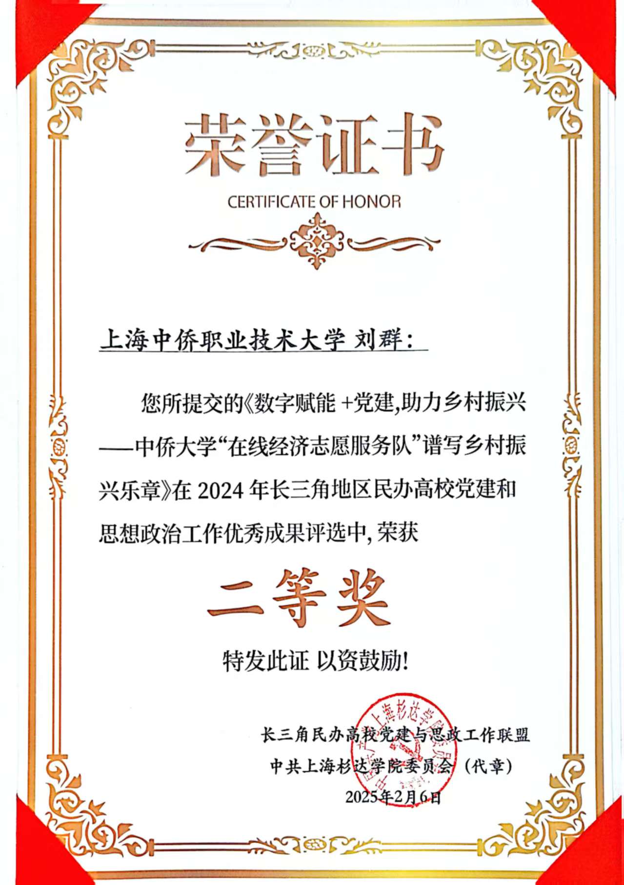近日,信息工程学院党总支书记刘群的《数字赋能+党建,助力乡村振兴——中侨大学“在线经济志愿服务队”谱写乡村振兴乐章》在“长三角地区民办高校党建和思想政治工作优秀成果评选”中喜获二等奖。荣誉的取得,充分体现了信息工程学院在党建与思政教育领域的创新探索和实践成效。