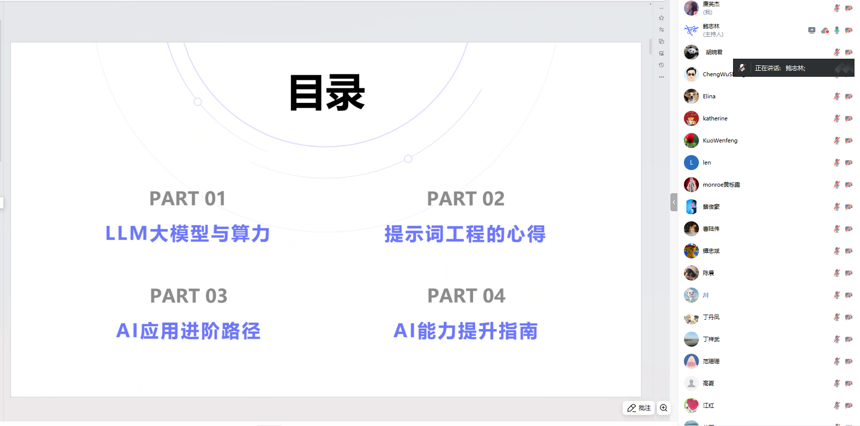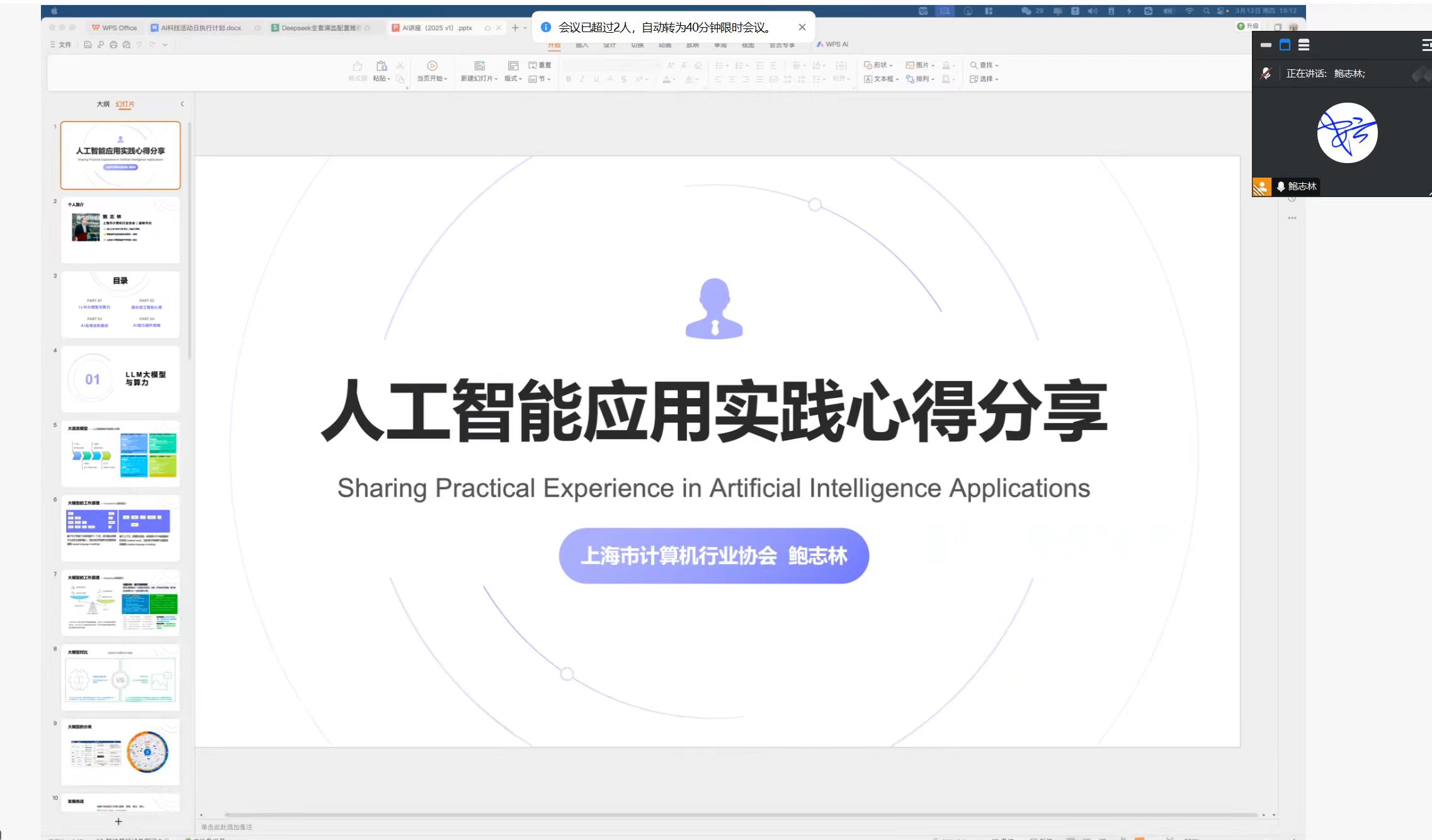 2024年3月13日晚19:00至21:00,信息工程学院成功举办了“人工智能应用实践”专题讲座。本次讲座通过腾讯会议平台进行,学院全体教职工积极参与。讲座特别邀请到上海市计算机行业协会副秘书长、智慧城市专业委员会秘书长鲍志林老师作为主讲嘉宾,为大家带来了一场关于人工智能应用实践的精彩分享。