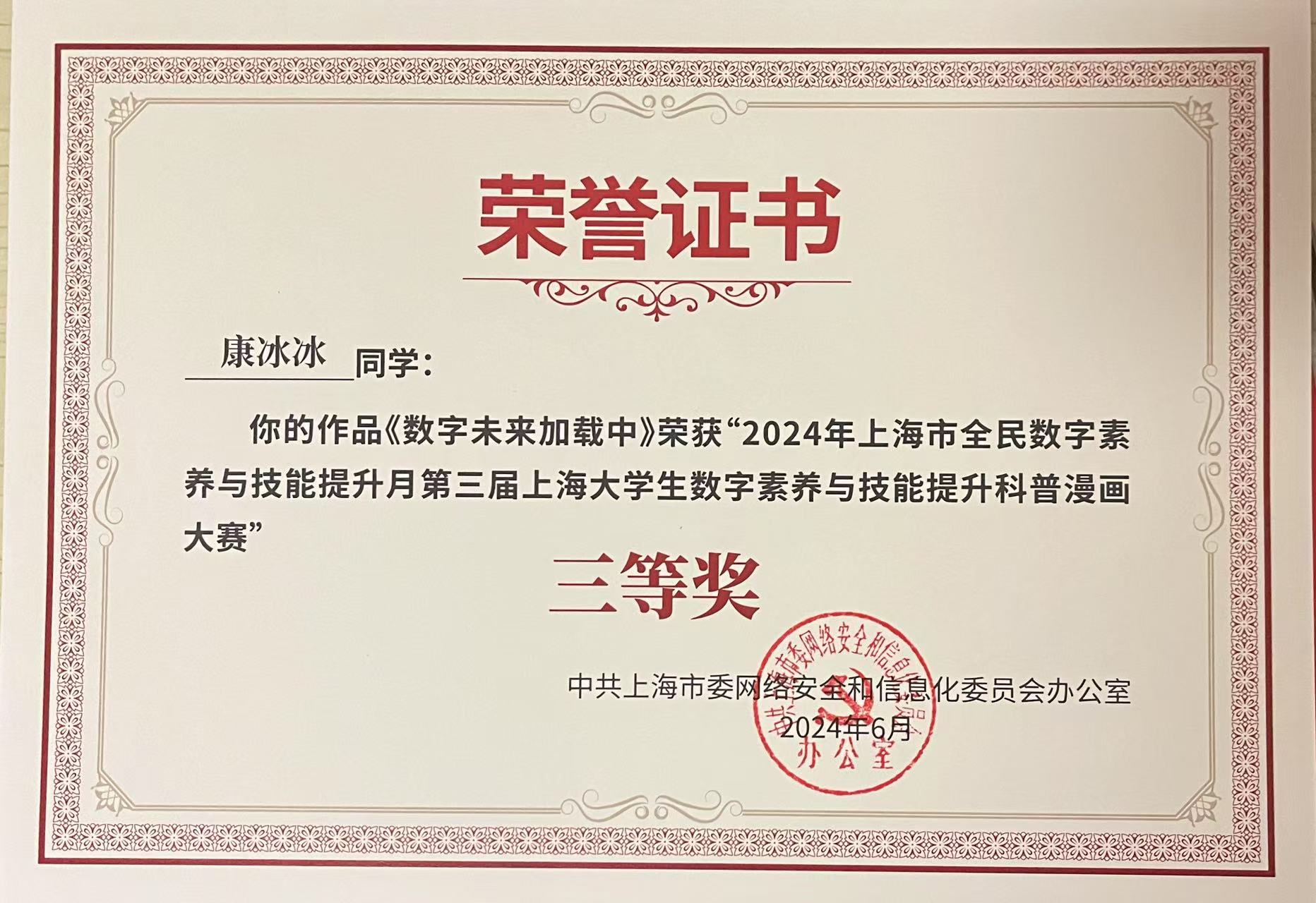 恭喜我院康冰冰同学在2024年上海市全民数字素养与技能提升月第三届上海大学生数字素养与技能提升科普漫画大赛中荣获三等奖
