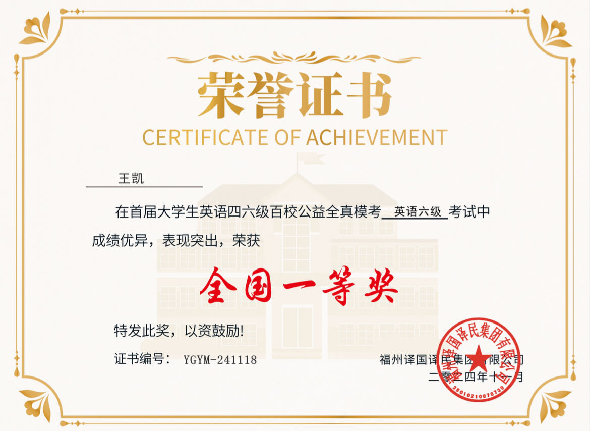 恭喜我院王凯同学在首届大学生英语四六级百校公益全真模考英语六级考试中荣获全国一等奖