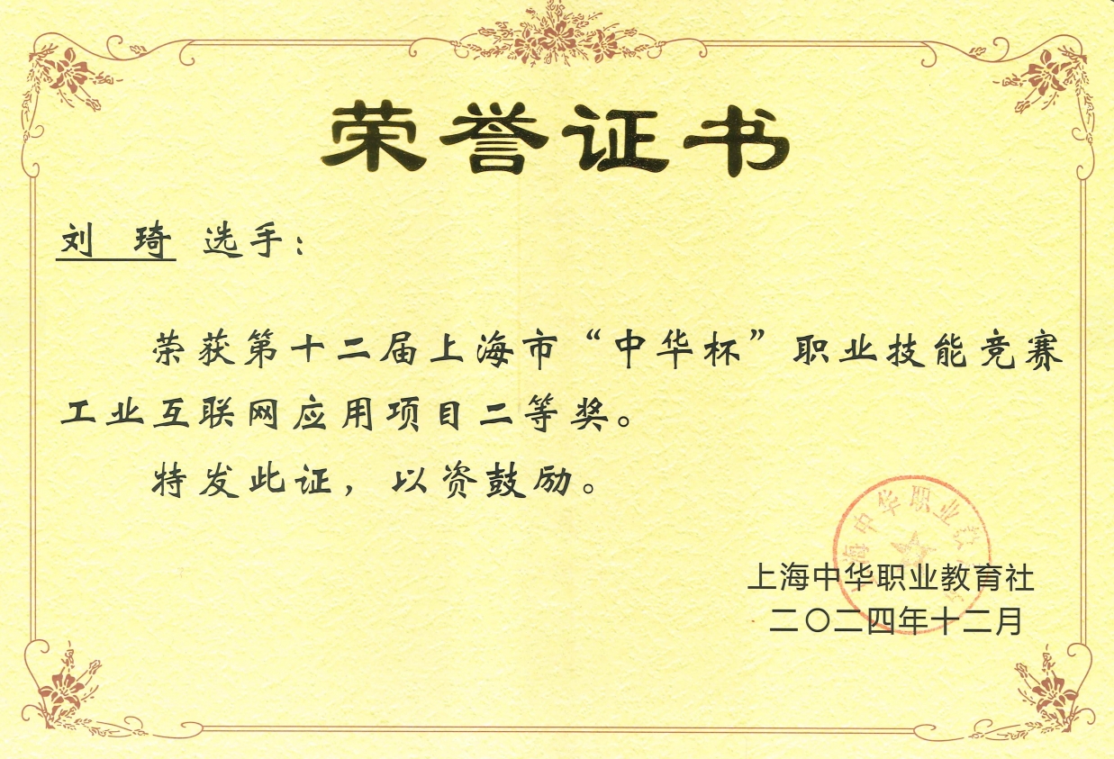 恭喜我院刘琦同学在第十二届上海市“中华杯”职业技能竞赛工业互联网应用赛项中荣获二等奖