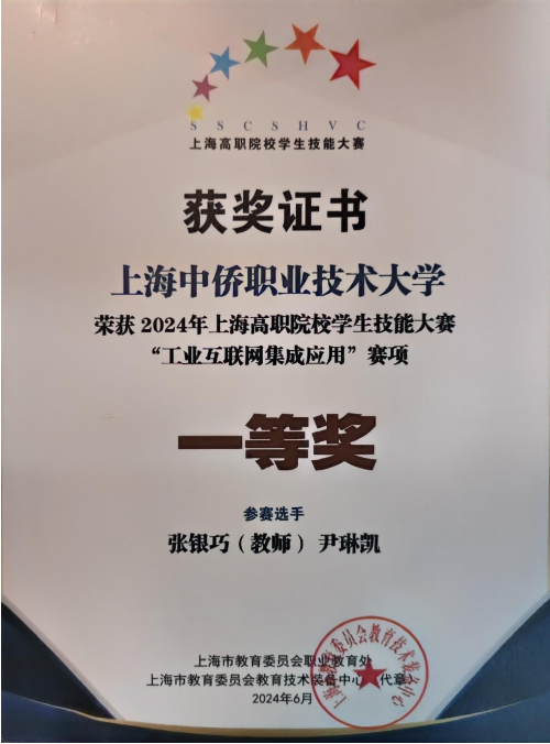 恭喜我院尹琳凯同学在2024年上海高职院校学生技能大赛“工业互联网集成应用”赛项中荣获一等奖