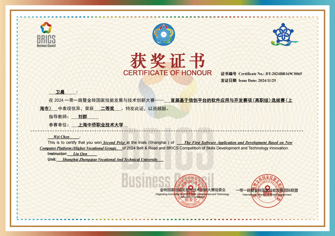 恭喜我院卫晨同学在2024 一带一路暨金砖国家技能发展与技术创新大赛中荣获二等奖