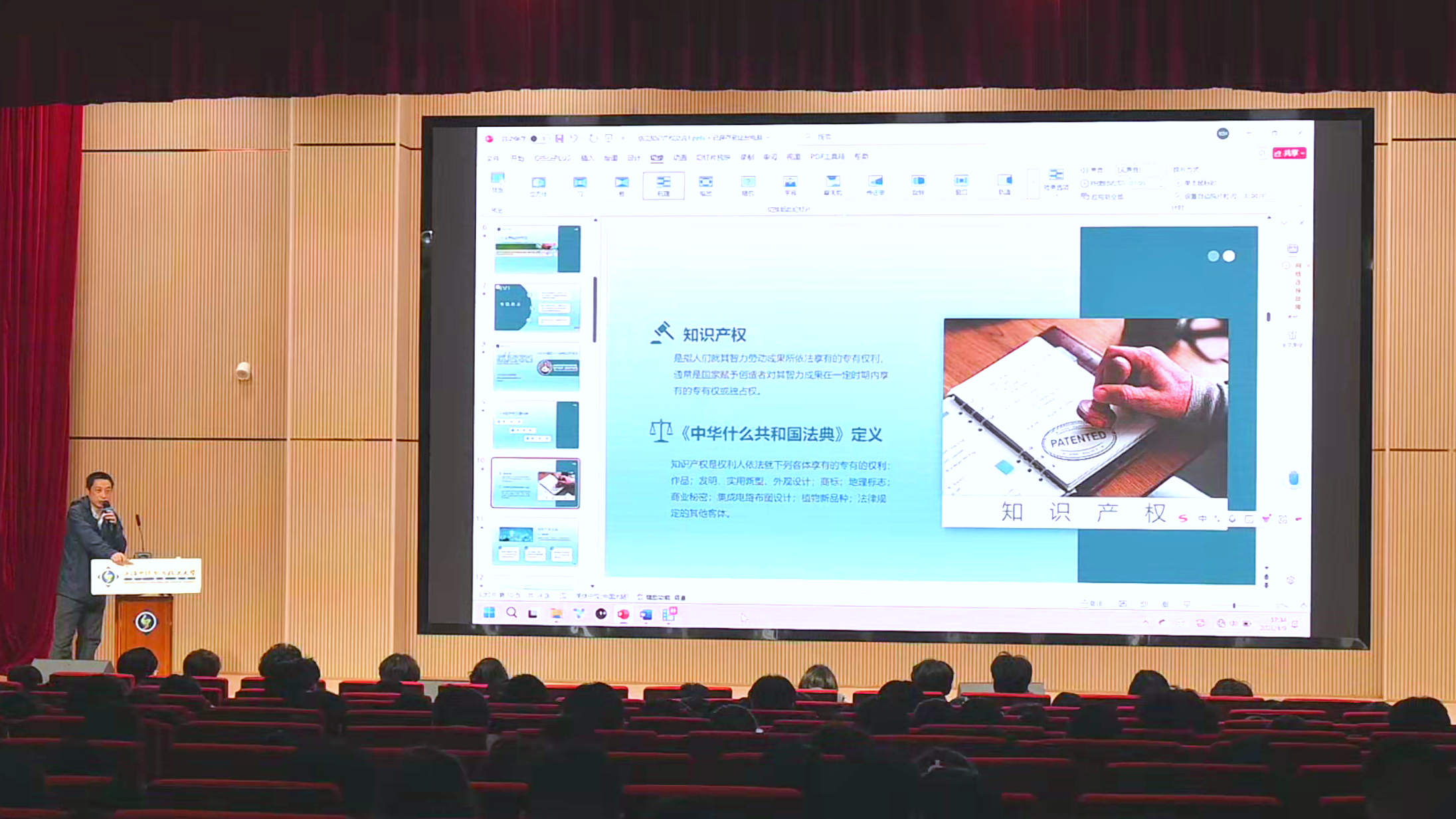 讲座伊始,胡伟老师以“世界知识产权日”为切入点,强调知识产权在推动科技进步和文化繁荣中的核心作用。他结合《中华人民共和国著作权法》《中华人民共和国专利法》等法律法规,解析了著作权、专利权、商标权的分类及法律特征,指出“知识产权不仅是创新成果的‘保护伞’,更是国家科技竞争力的战略资源”。