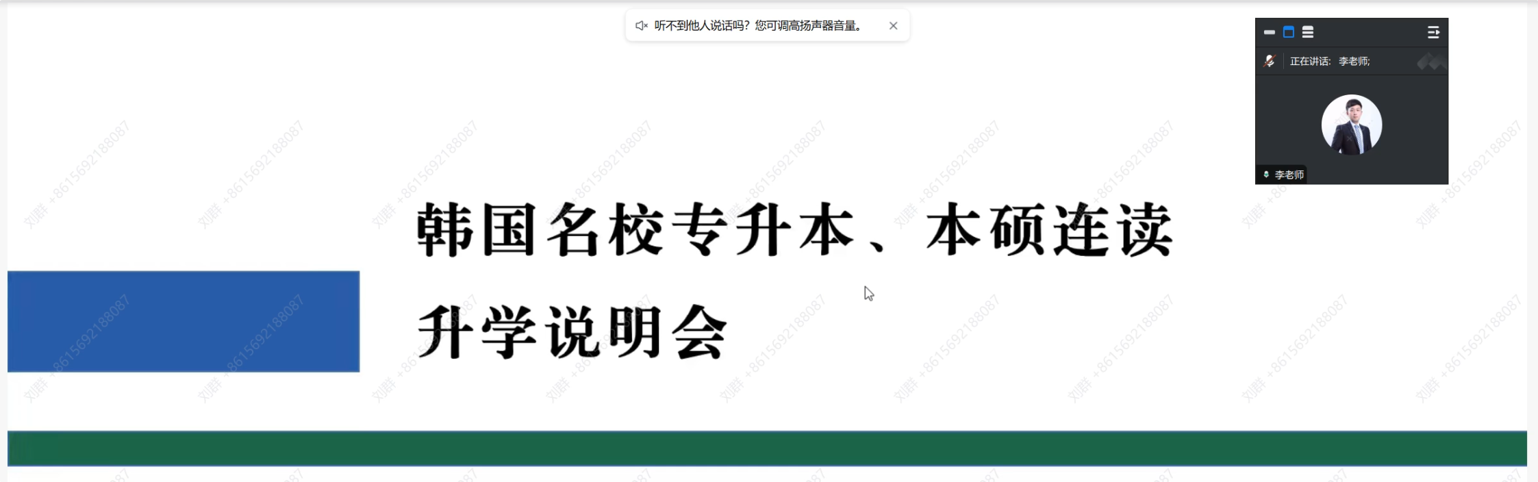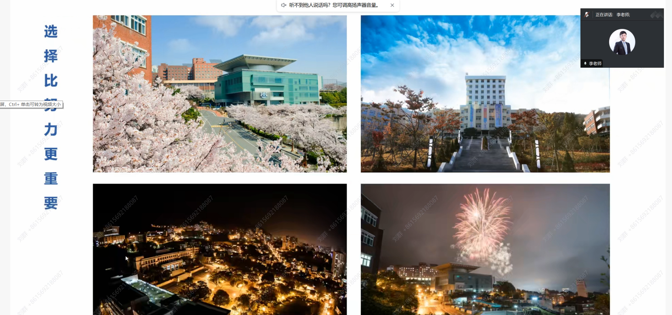 韩国留学项目负责人李文俊在会上对庆南大学的相关情况进行了全面介绍。李文俊详细讲解了庆南大学的历史沿革、学科优势、师资力量以及校园文化等方面。庆南大学作为韩国知名高校,在多个学科领域具有卓越的教学和研究水平,为学生提供了优质的教育资源和广阔的发展空间。让同学们更直观地感受庆南大学的校园氛围和学习环境,通过播放庆南大学的宣传片,展示美丽的校园风光、现代化的教学设施以及丰富多彩的校园生活,给同学们留下了深刻的印象。