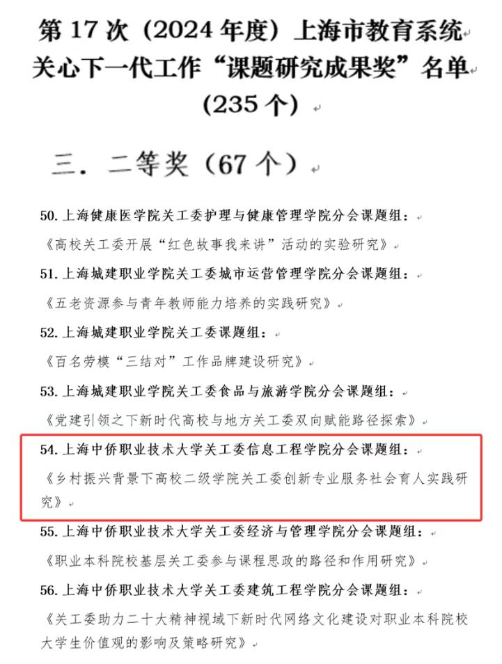 上海中侨职业技术大学关工委信息工程学院分会课题:《乡村振兴背景下高校二级学院关工委创新专业服务社会育人实践研究》喜获二等奖。