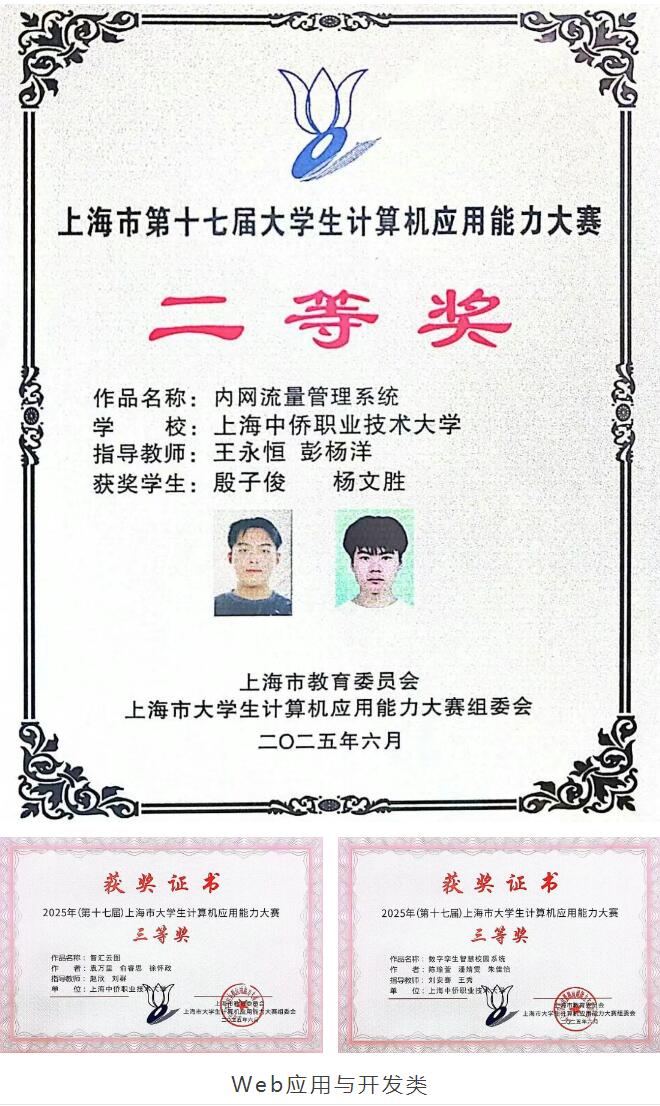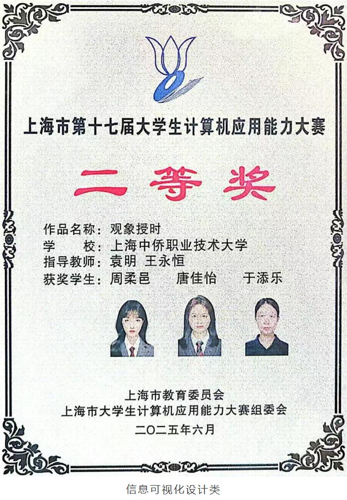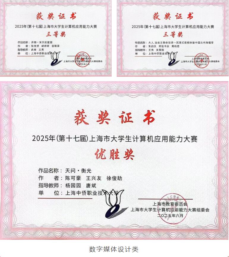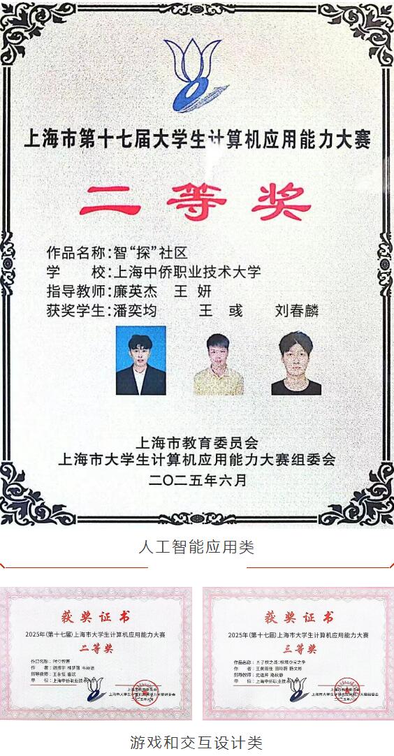 近日,我校在2025年(第十七届)上海市大学生计算机应用能力大赛中表现出色,斩获多个奖项,本科组获得5个二等奖,6个三等奖,2个优胜奖。专科组获得2个二等奖,1个三等奖!