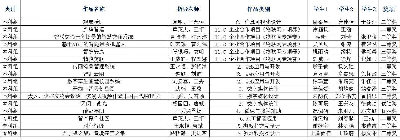 本届赛事参赛类别覆盖了企业合作项目(物联网专项赛)、Web应用与开发、数字媒体设计、微课与教学辅助、游戏和交互设计、人工智能应用、信息可视化设计等多个类别。经过激烈角逐,7支队伍成功入围国赛。