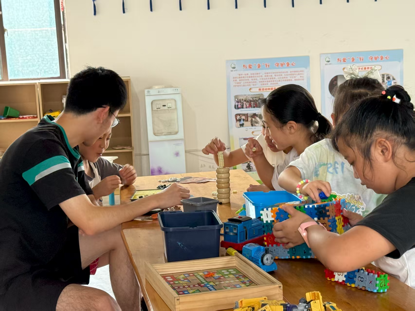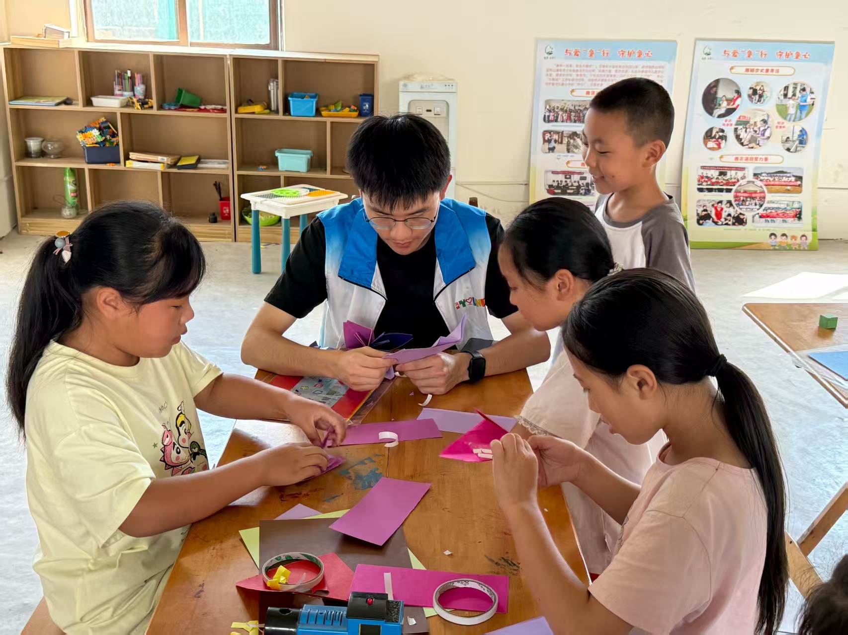 为让防溺水、消防安全等知识更易被孩子接受,他将枯燥的知识点转化为趣味PPT和动画,通过互动提问引导孩子主动思考;同时组织模拟火场逃生演练,让安全意识深植童心。在手工课堂上,他手把手教孩子们折卡纸、捏黏土,陪伴孩子们释放创造力,不仅传递了温暖,也收获了纯粹的童真快乐。
